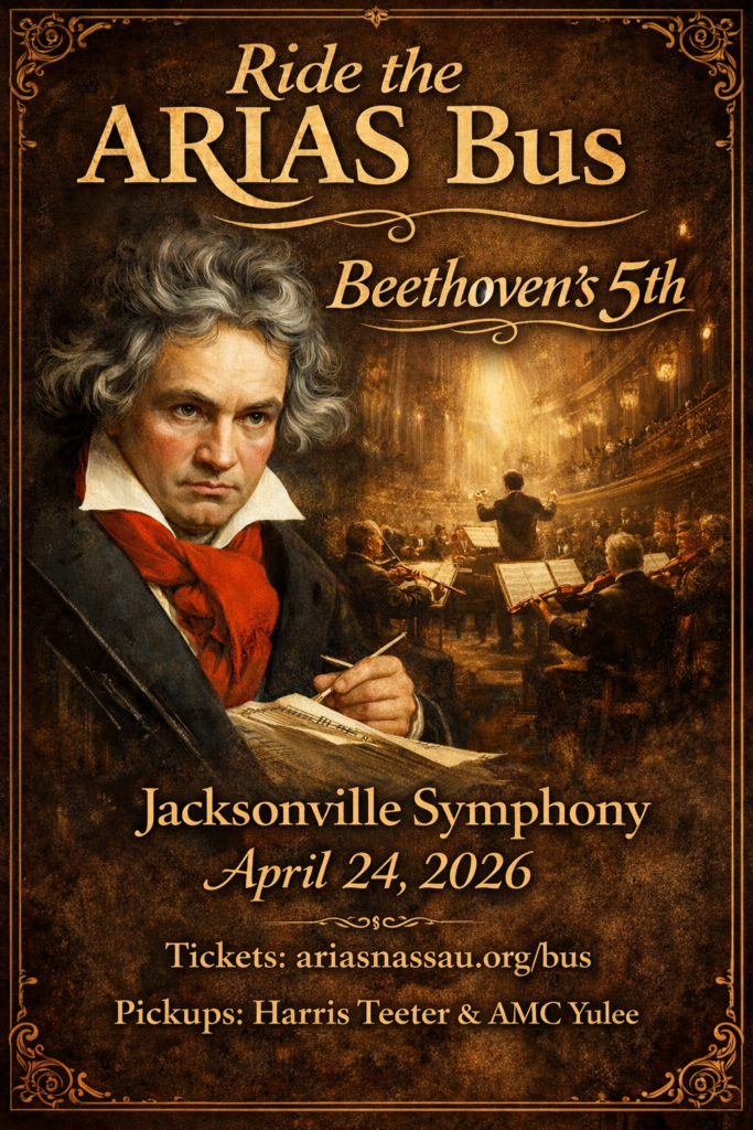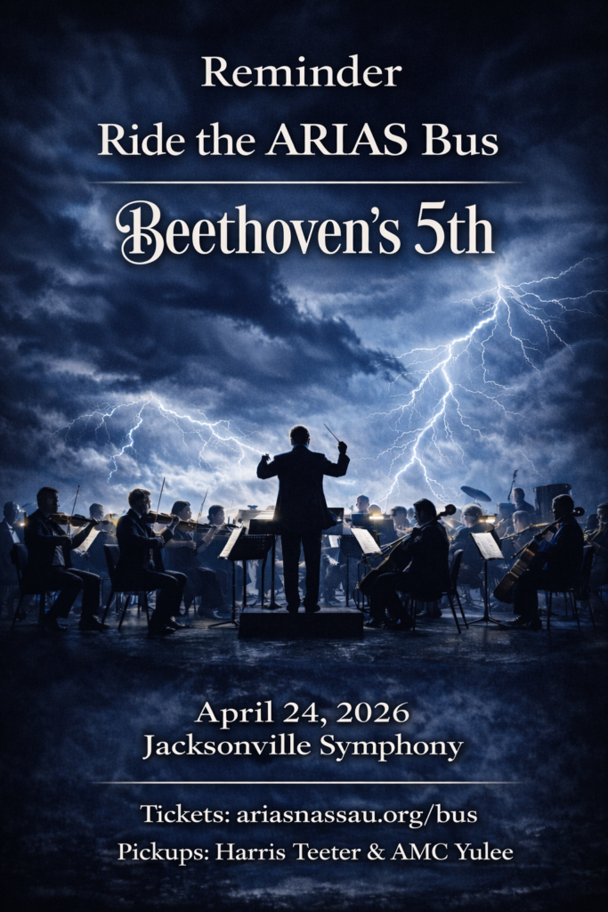 Bus tickets can be purchased at ariasnassau.org/bus, where you’ll also find details on pricing, pick-up locations, and discounts for ARIAS members. Please note that bus tickets are separate from concert tickets, which can be obtained through the Jacksonville Symphony website.